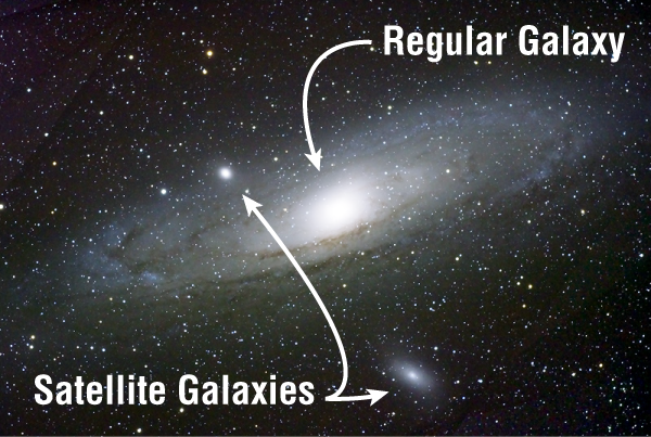 Galaksi satelit ini biasanya adalah galaksi kerdil atau “dwarf galaxies”, galaksi kecil dengan beberapa miliar bintang, berbeda jauh dari galaksi besar seperti Bimasakti yang memiliki ratusan miliar bintang.